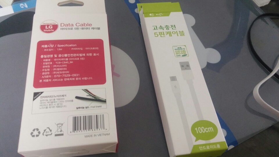 오른쪽 연두색박스의 케이블은 고속충전 가능하다고 써있는데