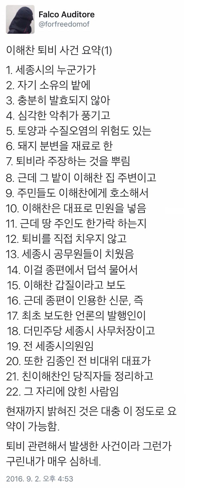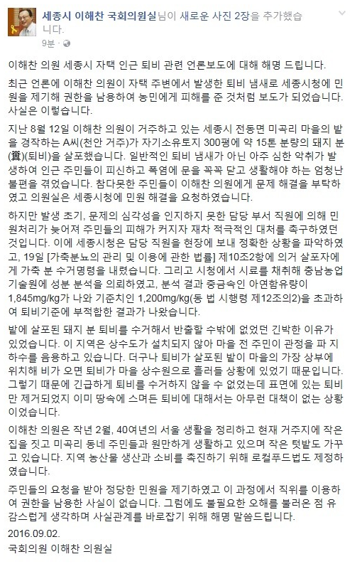 사실관계야 양쪽 입장이 있겠지만, 이해찬의원 주장만을 보면 15톤/300평 계산하면 한평에 50kg이네요.
