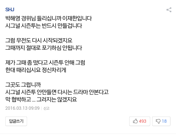 시즌2 지금 찬반 투표 지금 9:1로 찬성이 우세네요.