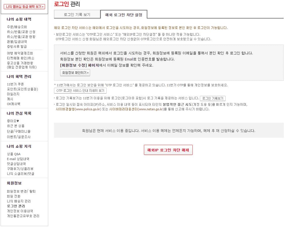 pc에서 나의 11번가로 들어가면 좌측 맨 아래쪽에 로그인 관리에 들어가시면