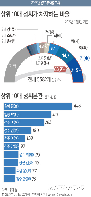*10대 성씨(%) : 金(21.5), 李(14.7), 朴(8.4), 崔(4.7), 鄭(4.3), 姜(2.4), 趙, 尹, 張, 林...