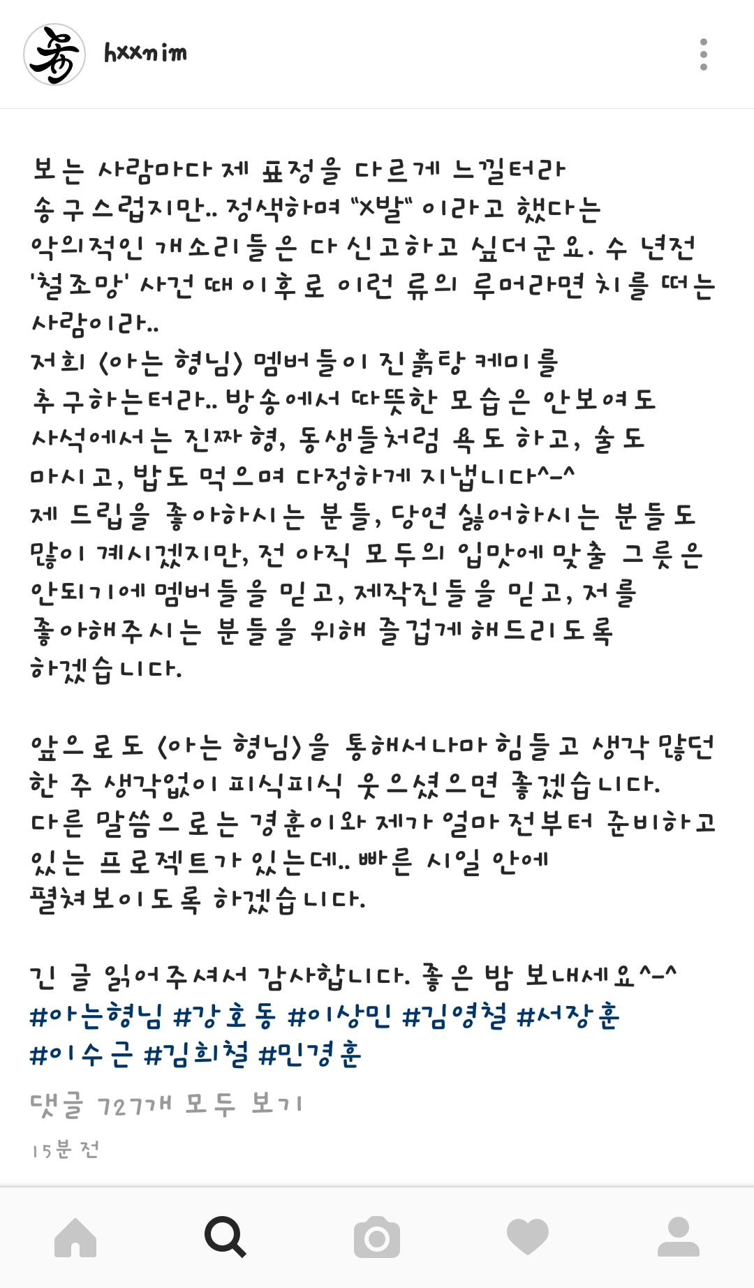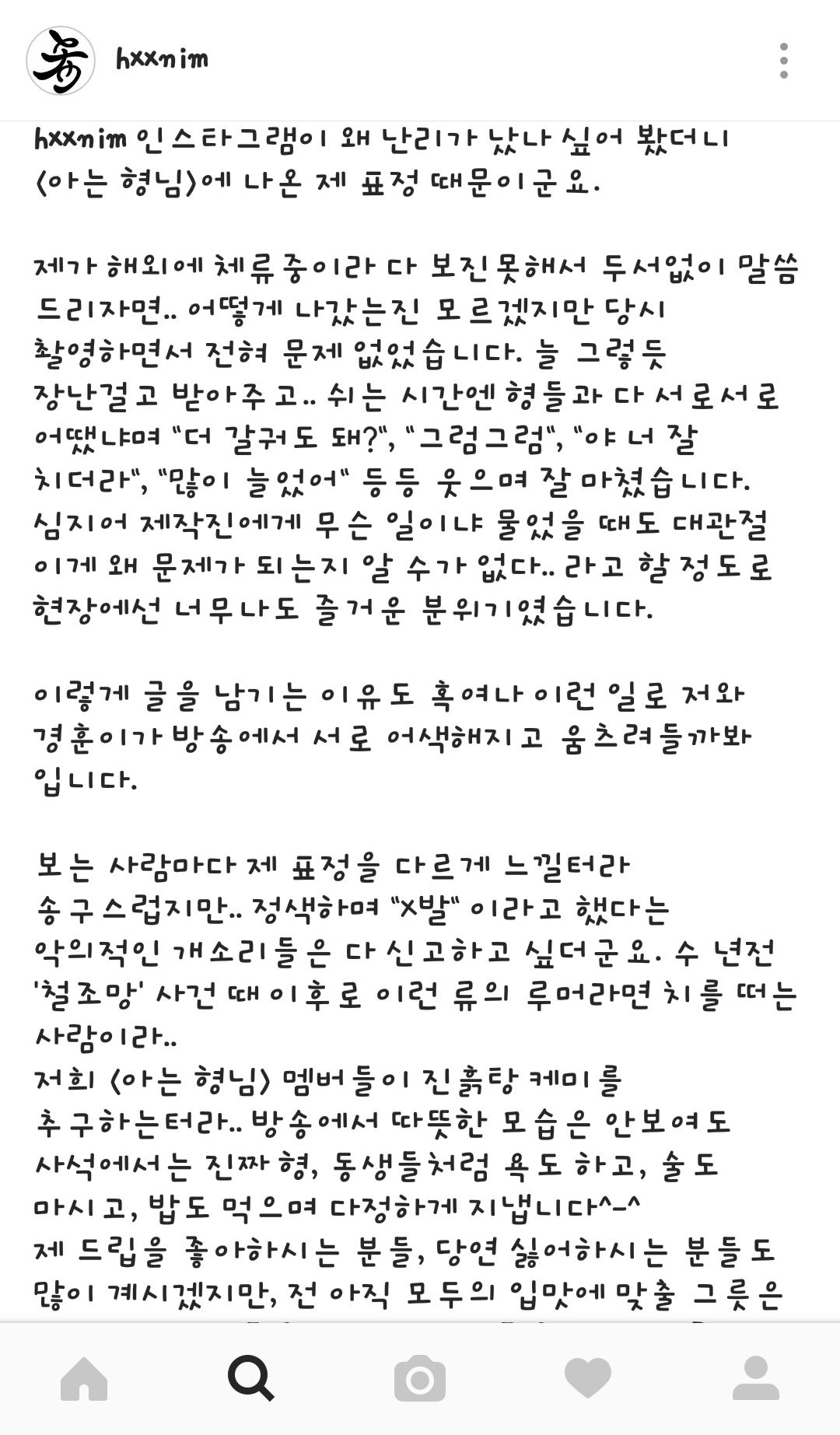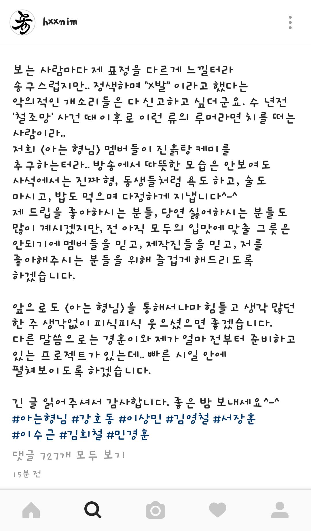 밑에 김희철 정색에 대해 김희철 인스타그램 글