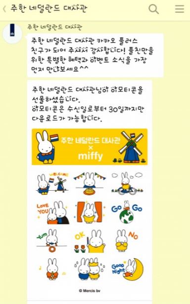 상단에 친구 추가 버튼을 누르시고 검색 창에 주한 네덜란드 대사관 '이라고 치면 나옵니다.