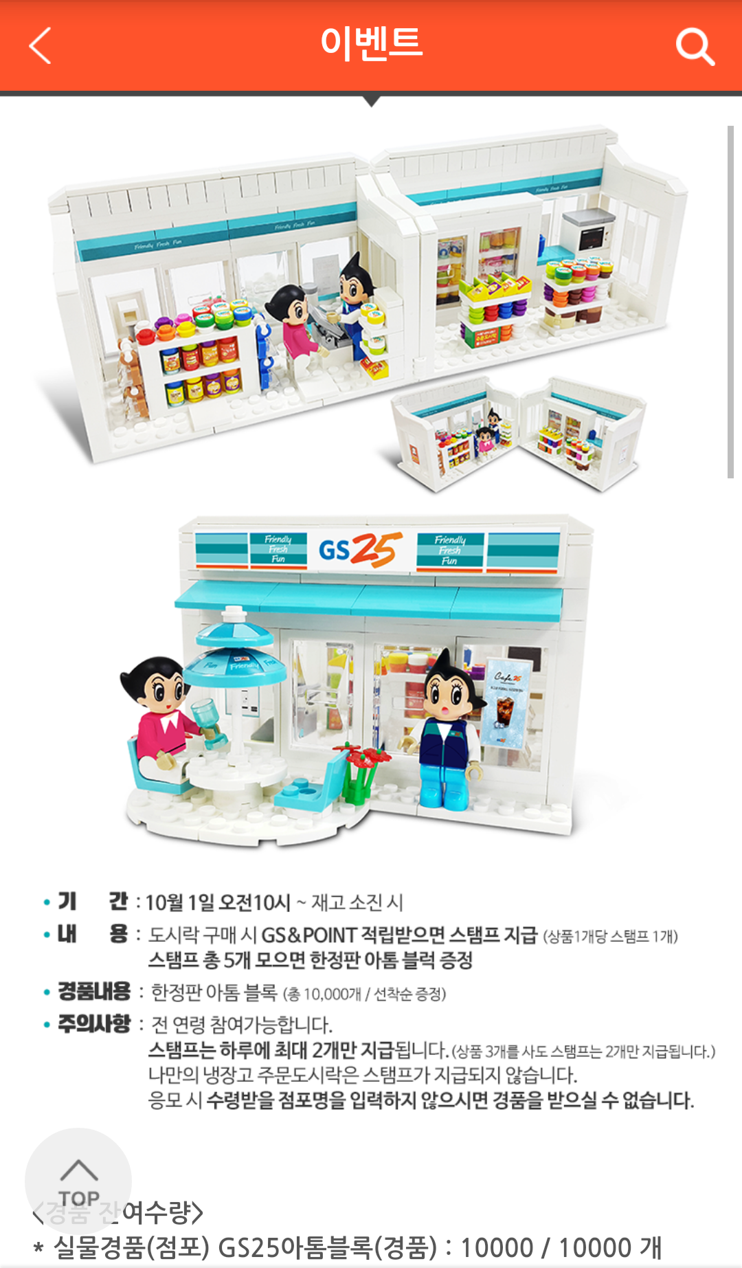 아톰보다 편의점 컨셉 레고라서 수량 금방떨어질듯? 조건도 gs치고 간단하고