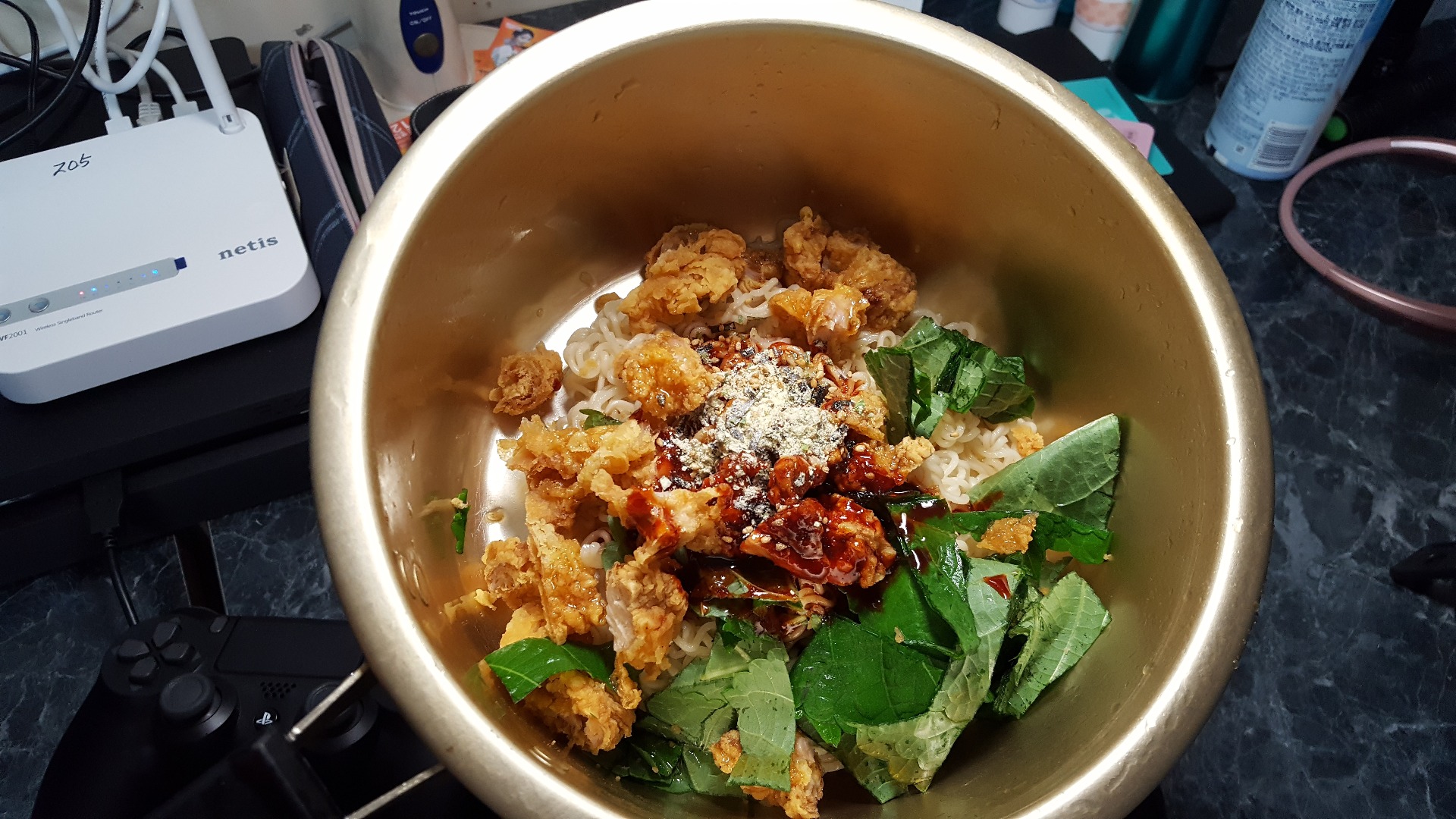 먹다남은 치킨 비빔면에 깻잎넣고 참기름 솔솔 둘러서 먹어요..