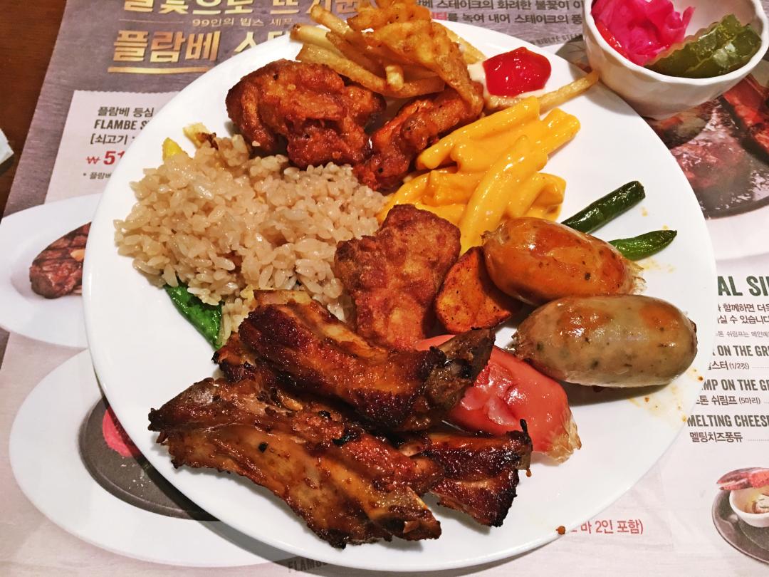 포크립 / 후라이드 치킨 / 소세지 / 구운감자(?) /크레이지 리치 치즈 / 나시고랭 / 감자튀김 / 프렌치프라이즈 / 벌집감자 / 감귤 주스 / 피클 리필