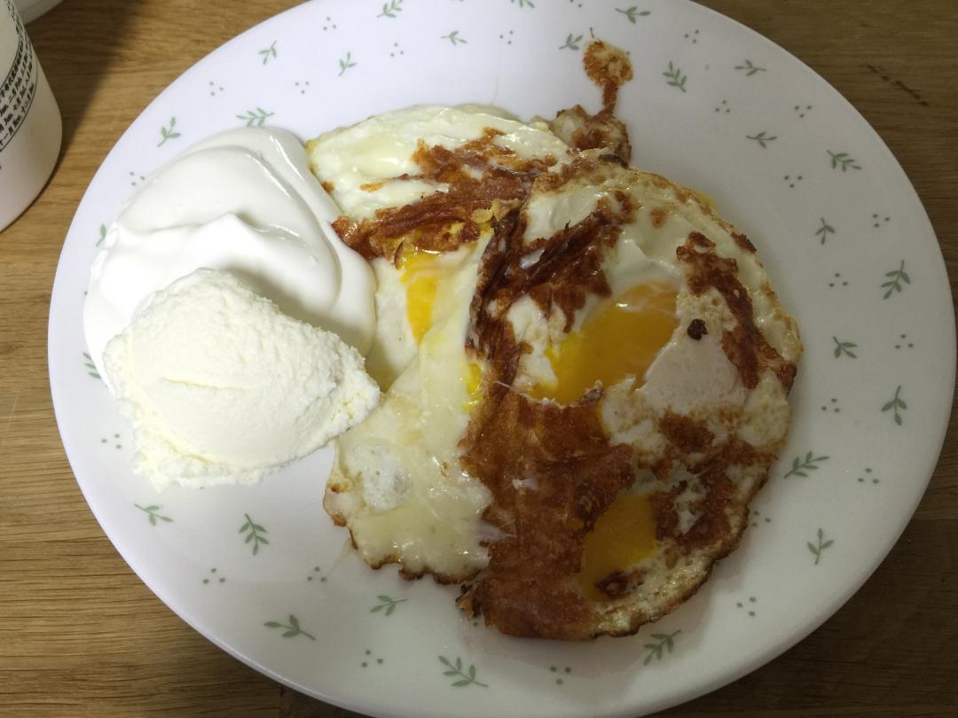 오늘 아침은 버터에 구운 계란 두개에 모짜렐라 치즈 얹고, 리코다치즈 한수저, 사워크림 한수저