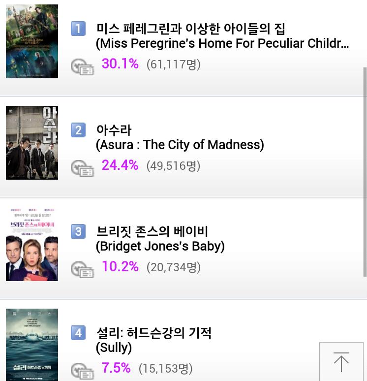 아수라 첫날 70% 웃돌았는데 이번주 예매율 순위가 바뀌었네요~ 지금은 미스페레그린 1위 올라섰네요