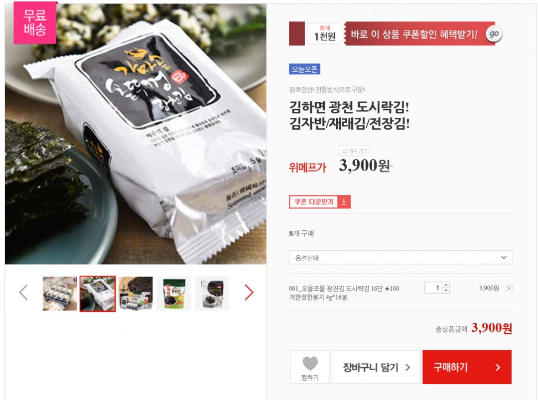 광천김 도시락김 4g*16봉 (3,900원/무료)