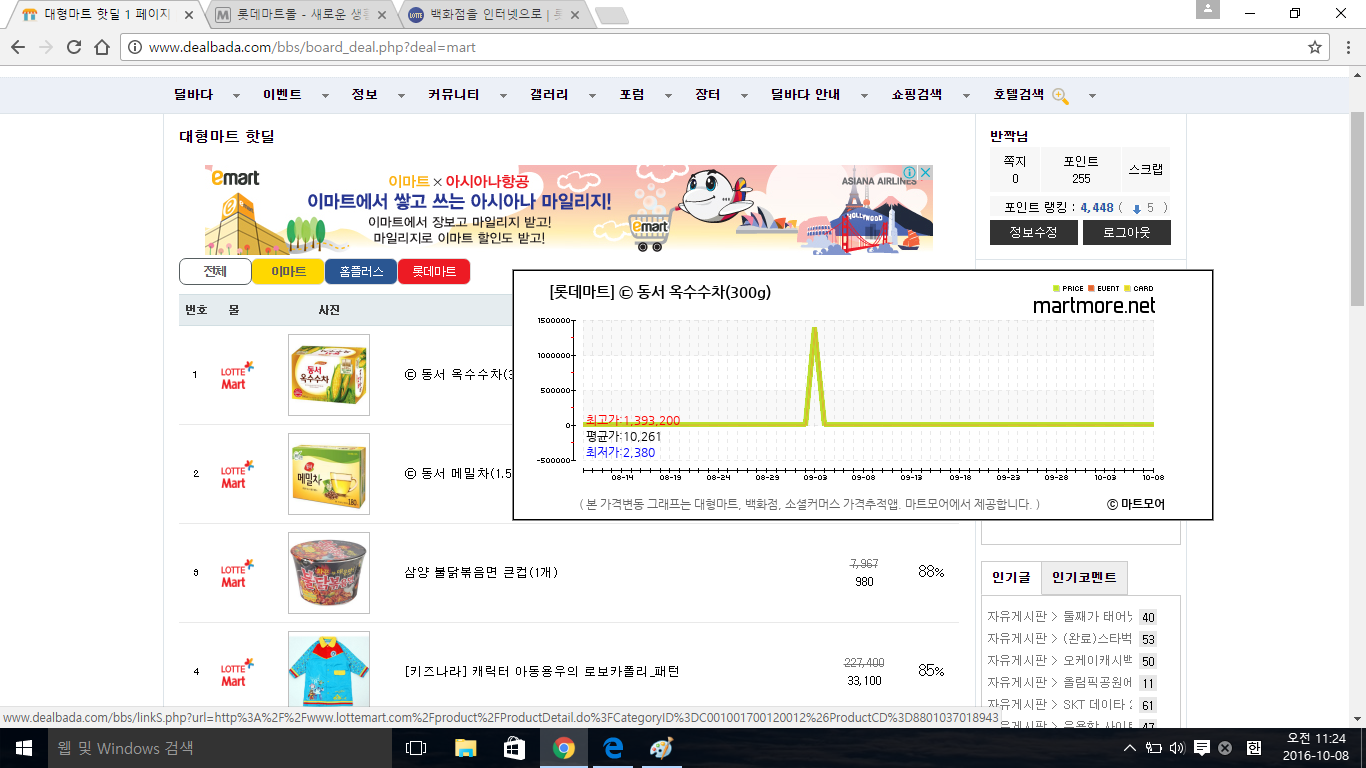 롯데마트에서 순간 보리차 15만원으로 올렸었는데 그 가격으로 평균가격이 달라지고 할인률이 달라지네요.. 메밀차도 그렇고...