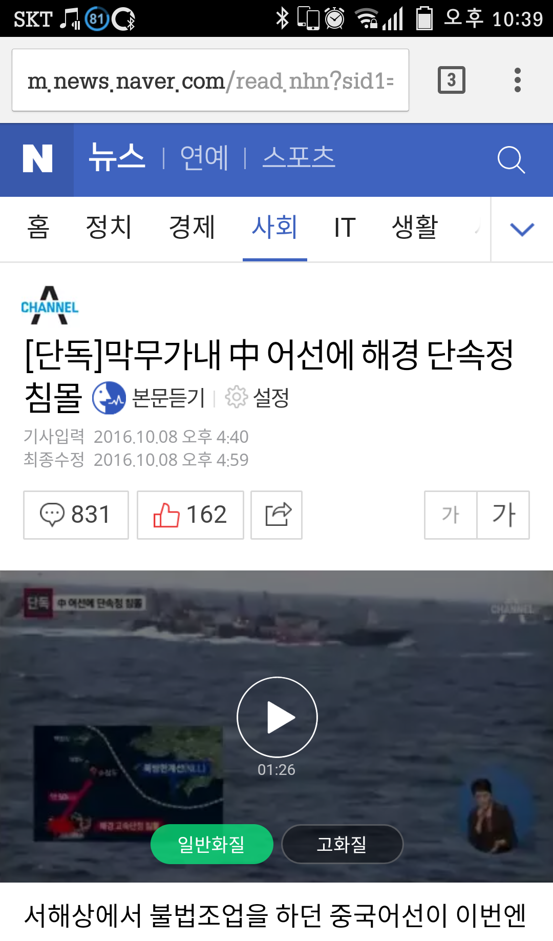 중국어선 이제 한국 단속함정도 침몰시키는군요 실사격 가능하게 법 개정을~