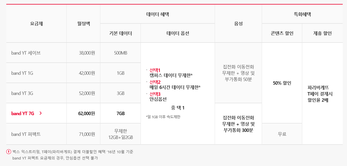 3. 전용 데이터 무제한 혜택 : 일 1GB 이후 속도제어(band YT 퍼펙트 : 최대 3Mbps, band YT 세이브/1G/3G/7G : 최대 400kbps)