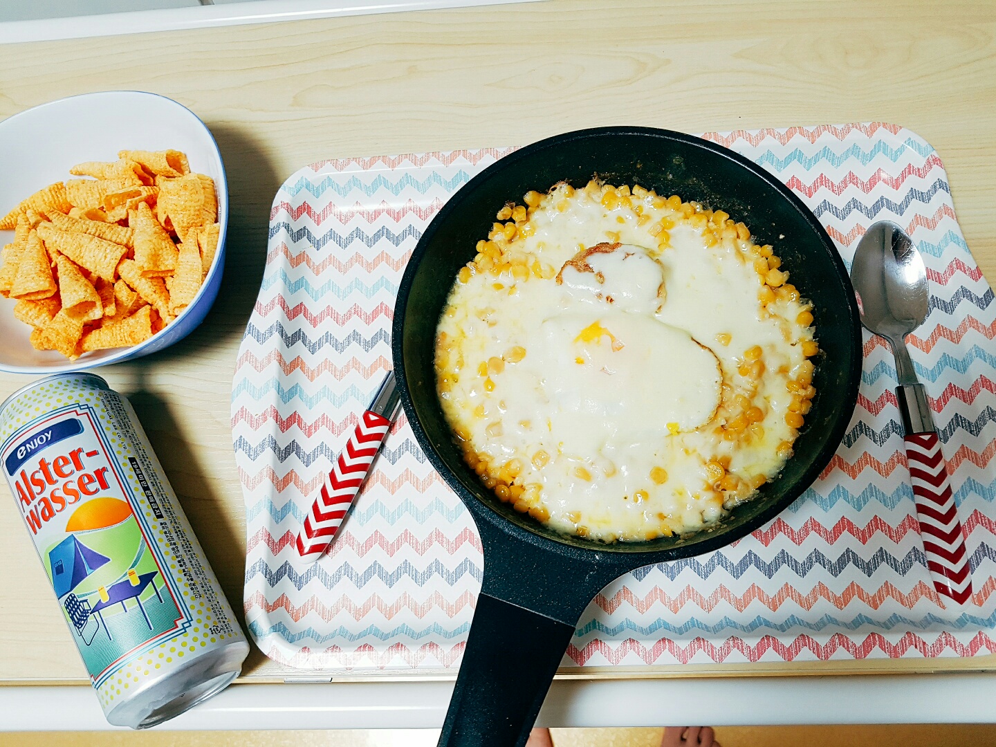 안주는 집에서 만든 콘치즈와 꼬깔콘입니다