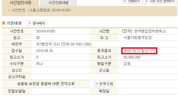 그래서 행정법원에서 다투고 있는 겁니다... 병무청이 최군에게 현역병 입영 통지를 보냈고, 최군은 병무청의 현역병 입영 처분을 취소해달라는 소송을 법원에 낸거거든요... 법원에서는 이 처분에 절차(신체검사)상 문제가 있다고 본거고요. |