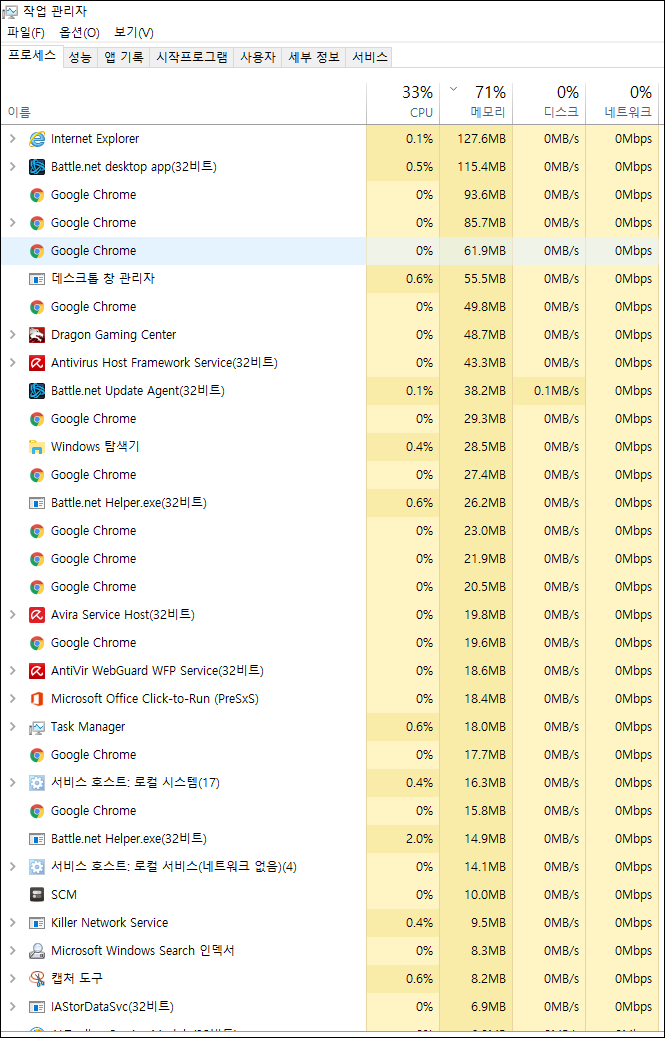 사진상으로 보기에는 메모리를 저렇게 잡아먹는 프로세스가 없는데