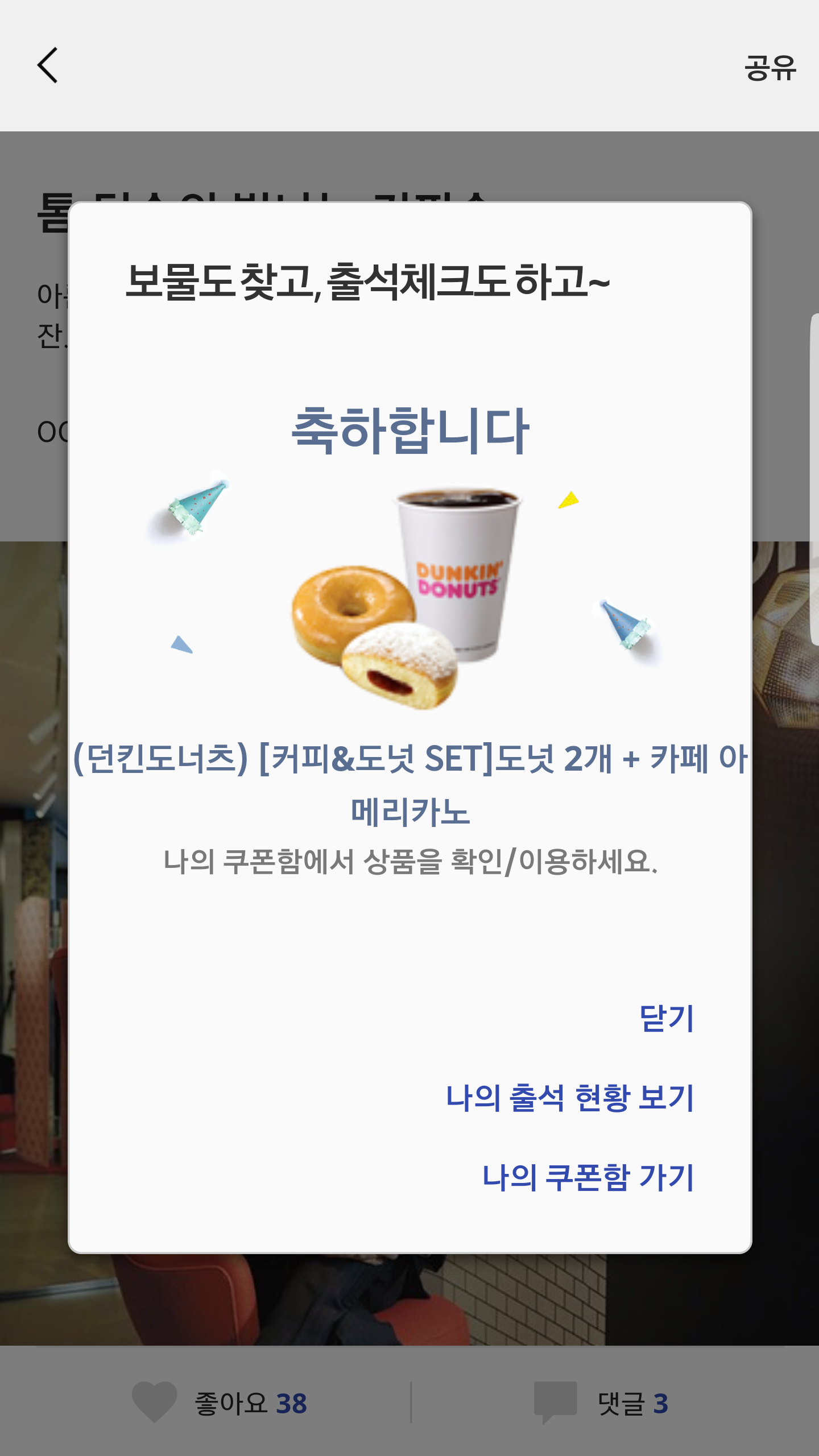 전 지겹네요.. 배스 , 던킨 ㅠ. 까페베네인가 하는 당첨되다가 다시 배스 ㅠ |
