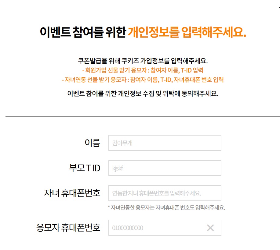 요렇게 3개만 입력하시고 동의2개 체크하시고 응모완료 하시면 쿠키즈회원가입선물 문화상품권1매랑 쿠키즈 3000원쿠폰이 뜸