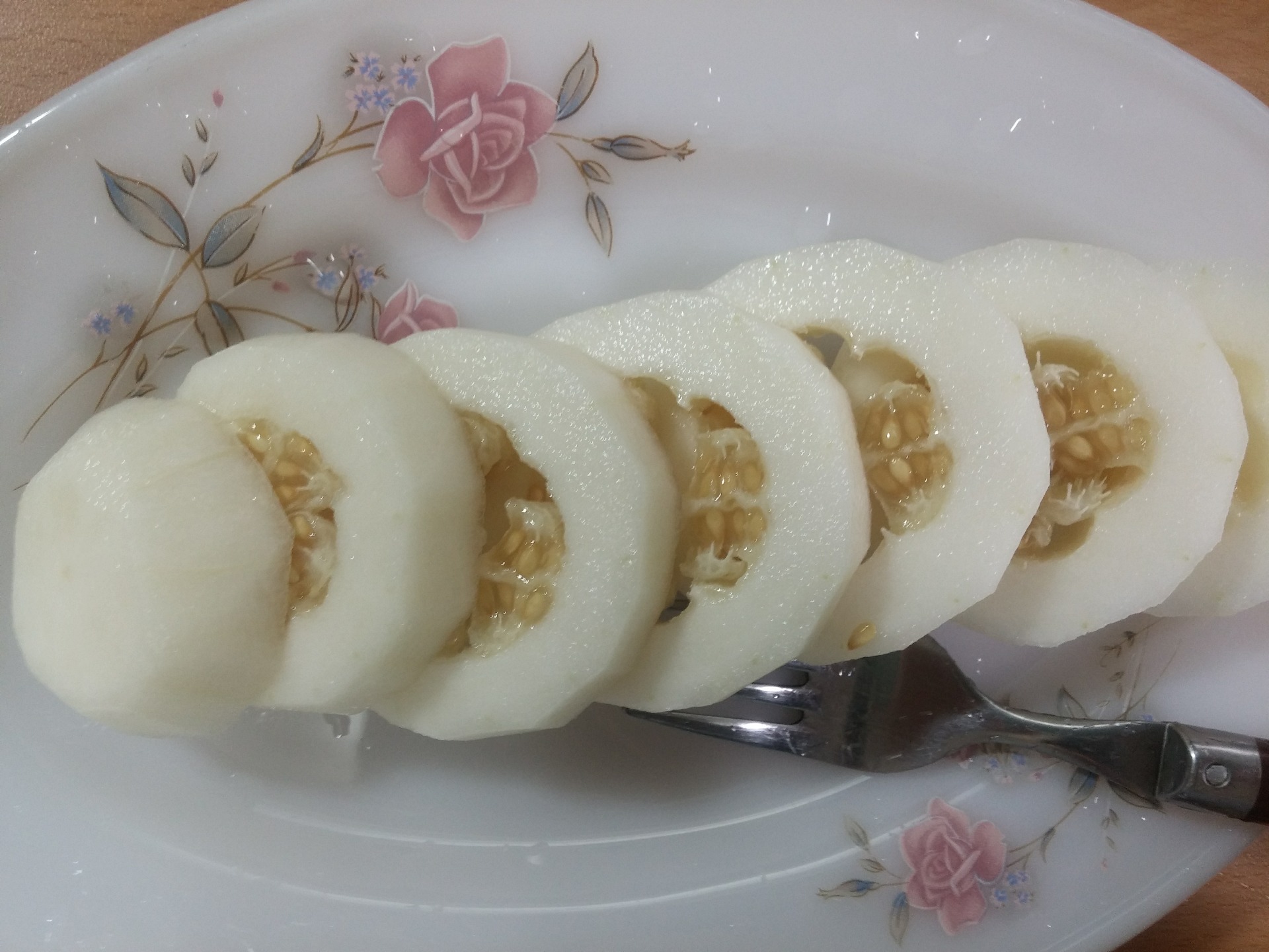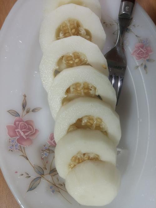 엄마가 저번에 과일껍질이랑 참외씨 흙에다가 버렷다는데 참외가 자라서 수확해서 아침밥으로 참외 먹엇네요 크기는 작지만 달고 차갑고 맛잇네요 ㅎㅎ
