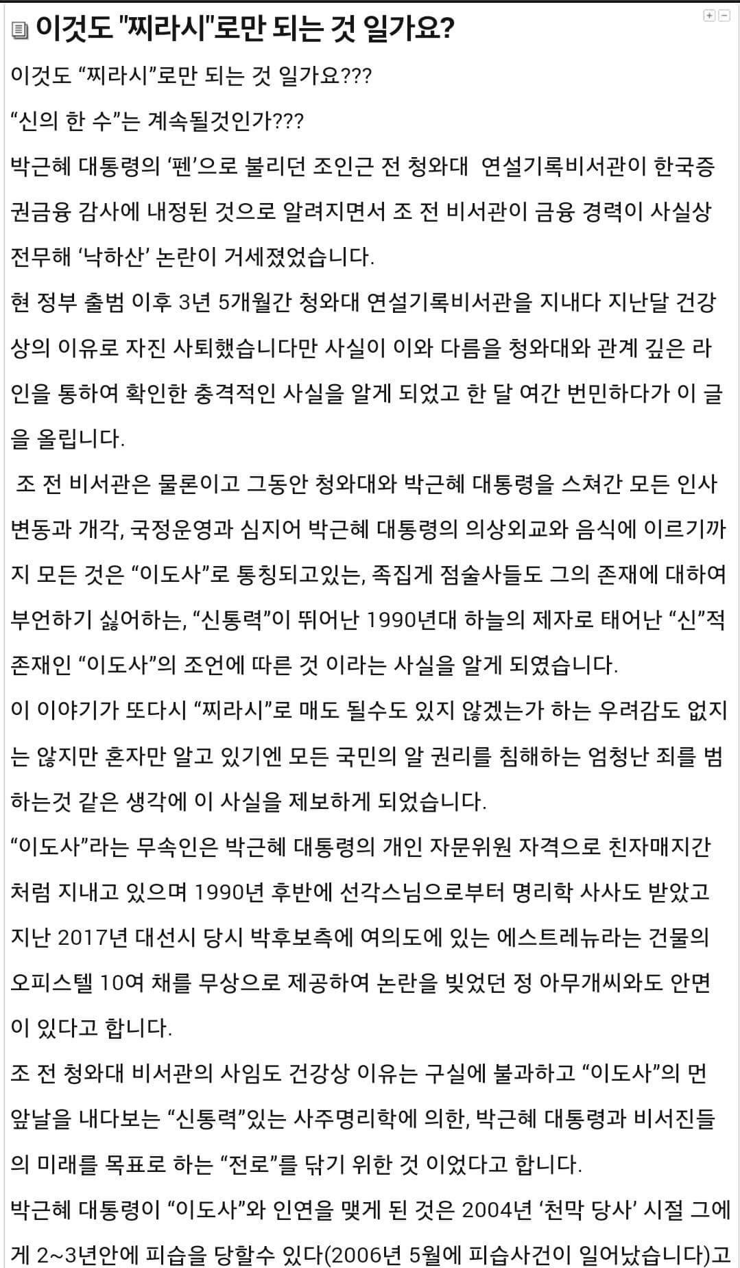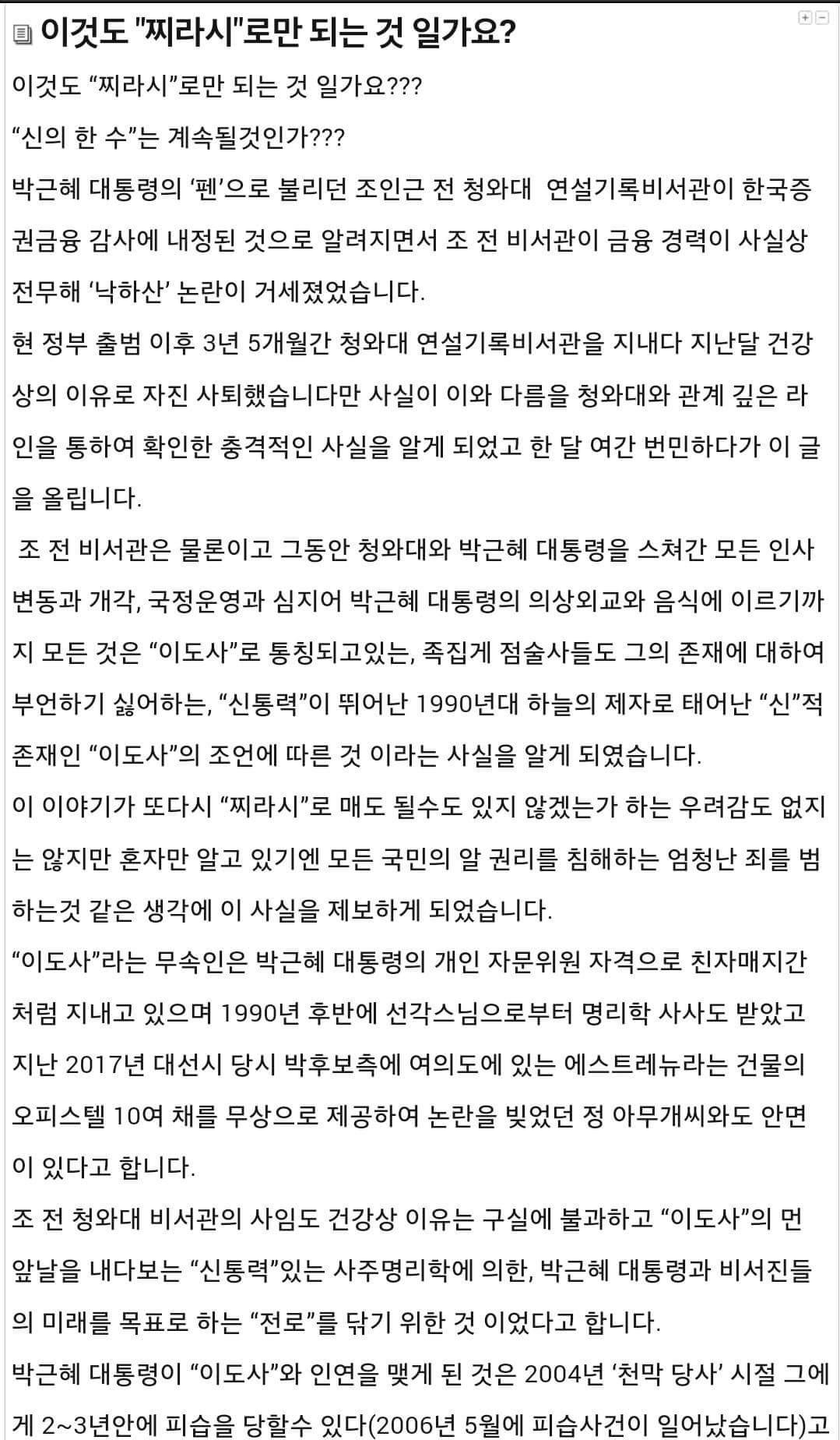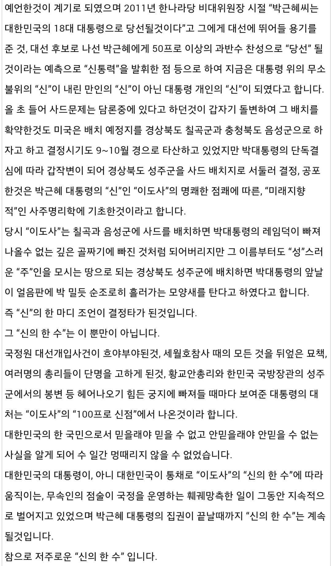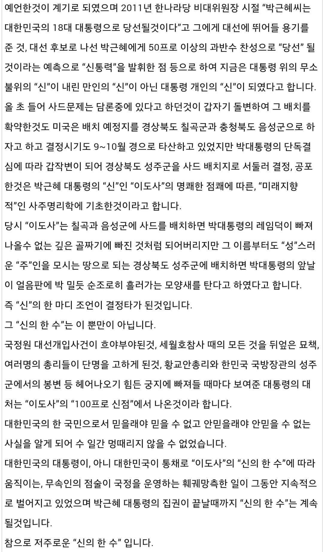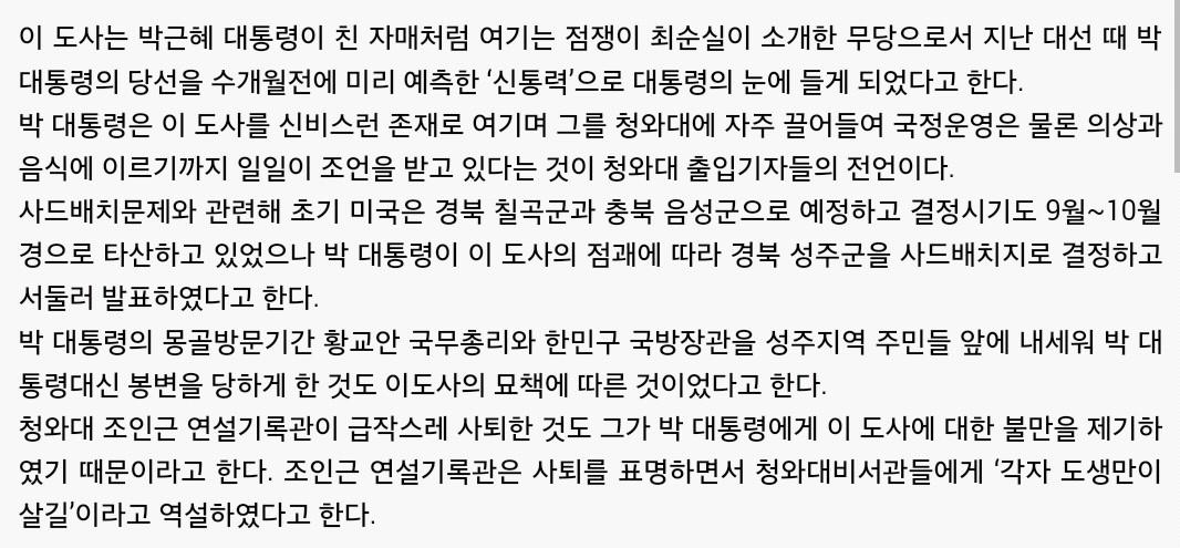 최순실 소개로 만난 무당들(한명이 아닙니다. 크게 취임전후로 나뉘더군요) 통해서 정기적으로 굿벌여 왔다는 이야기는 기자들이 아직 안터트리고 홀드하고 있는 사건이죠. 대선전에는 소문 수준으로 돌던이야기인데 이젠 팩트체크 까지 다되어있다고 하더군요.대통령의 정기적 억대 굿판은 콘크리트 지지층에게도 견디기 힘든 역대급 충격일겁니다.