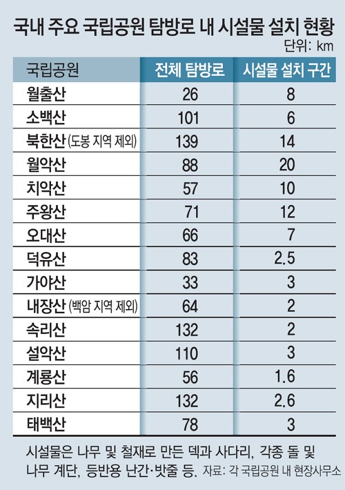 2. 국립공원, 탐방로 10%가 철계단, 나무데크... → 너무 많은 등산 편의시설물. 편리함도 있지만 자연성 해친다.(동아)▼표