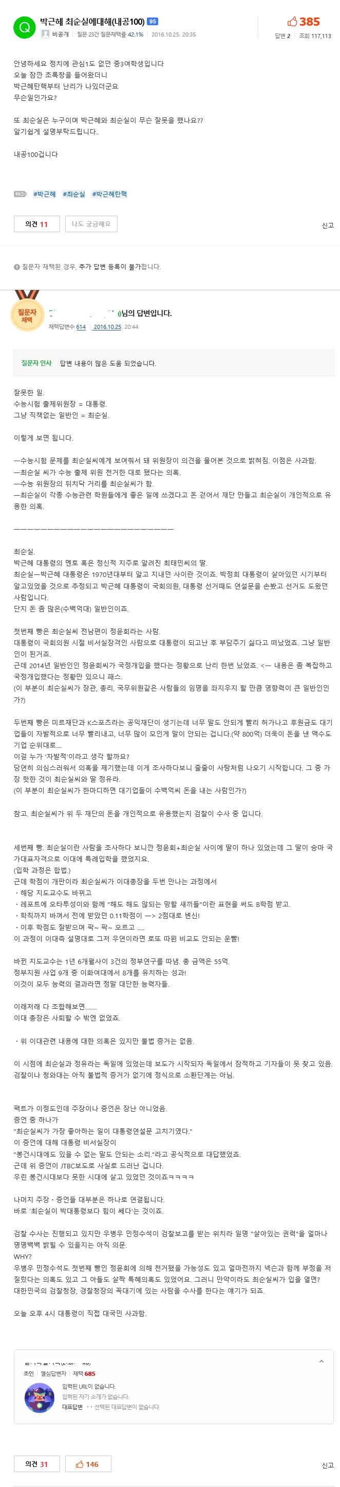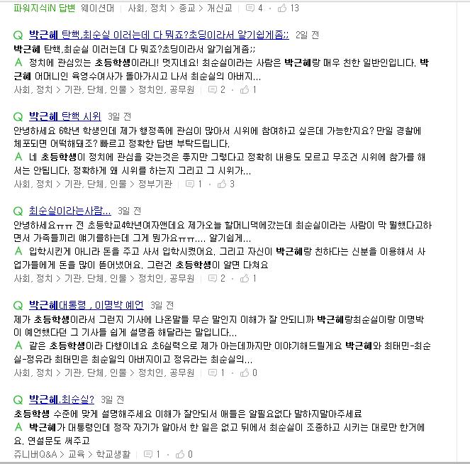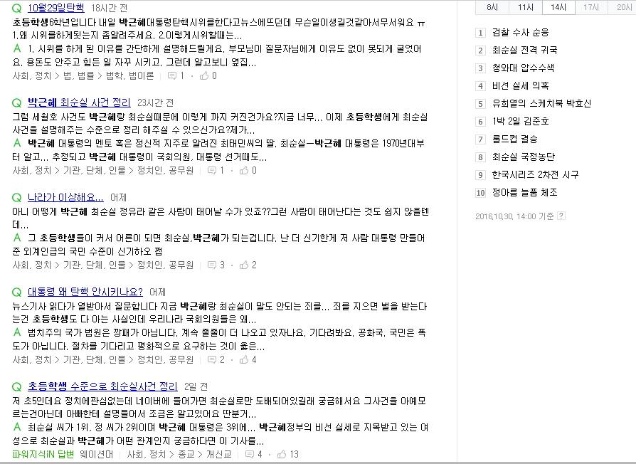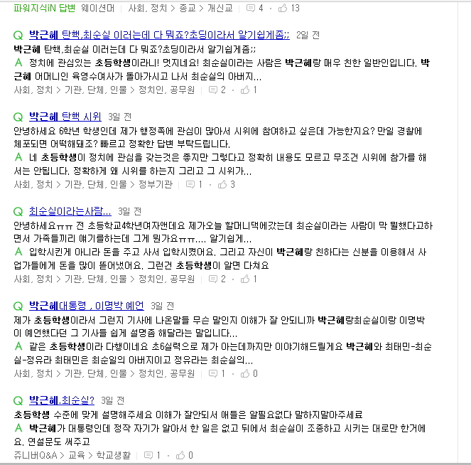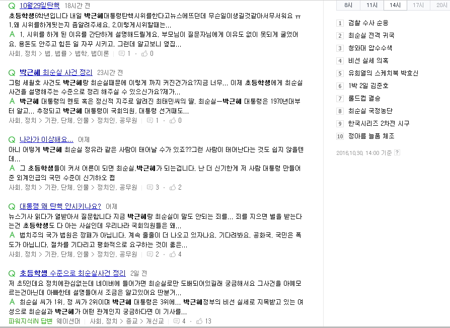가족, 주변 사람들이 이야기를 하는 것을 들었다거나 검색어에서 자주 보다 보니 자세히 알고는 싶지만 탄핵, 하야같은 용어라던가 이번 사건이 조선일보, 미르재단 등 여러가지 사건이 연관되어 있기때문에 전체적으로 어려워서 이해를 못하는 아이들이 많은 듯 하네요