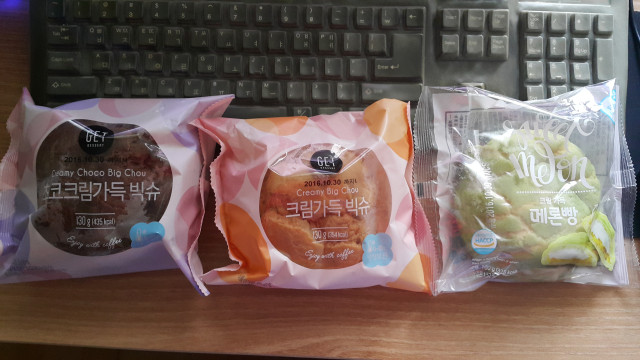 어제 시내 번화가 나가서도 가봤는데 메론빵은 없고 대신 슈크림빵 두종류가 보여서 낼름 집어왔네요.