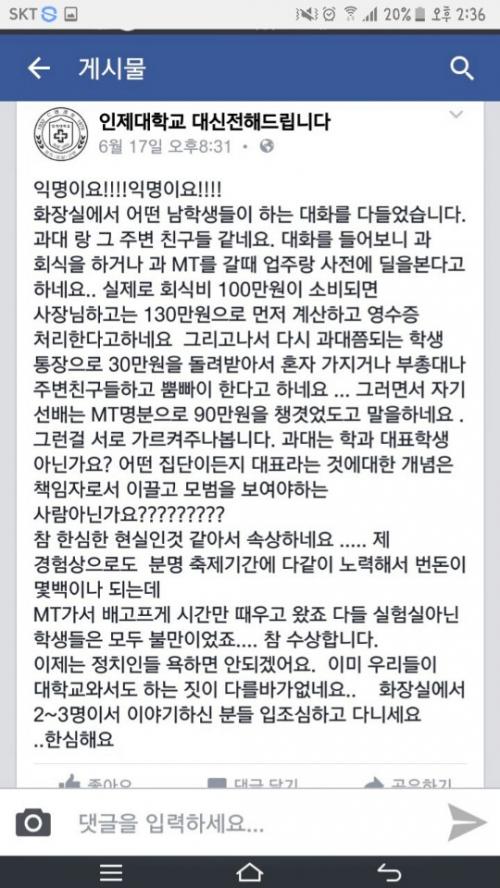 3번째는 인제대 페이스북에 올라왔었던 요즘 비일비재한 총학비리(카더라)