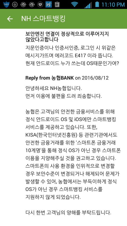 농협 왈: 고객님 폰 OS가 이상한 것...