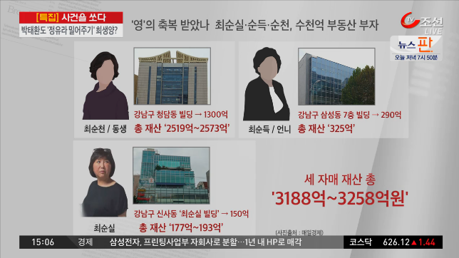 최순천씨는 남편이 사업해서 번돈이라고 하더군요. 남편이 저 두 자매랑 어울리지말라고 뭐라고 했다던데. 글쎄요 그 사업도 어떤 내막이 있을지는 모르겠습니다만... |