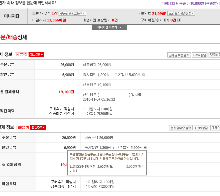 제 주문금액은 전에 주문했던것 포함 43890원(장바구니쿠폰포함)인데 21945원 적립됐습니다.