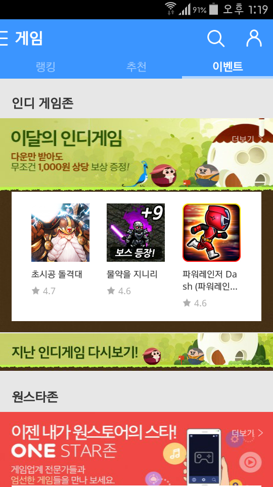 게임 카테고리 - 이벤트탭에서 인디게임존 더보기를 누르면