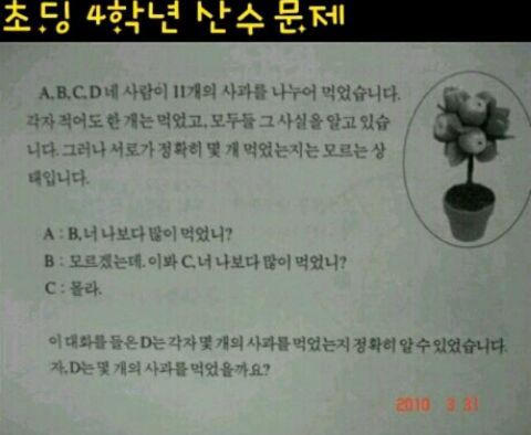 정답은 5개! a,b,c 각자 1개씩 먹었다면 나보다 많이 먹었냐고 물어보면 당연히 자신있게 아니라고 대답할 수 있을텐데 a,b,c 전부 각자 최소 분배량인 2개씩만 먹어서 모른다고 대답하는거 아닐까요? 3개먹은 사람이 있다면 이 중에 한명은 두개밖에 못먹었구나 예상하고 그렇다고 대답할 수 있을텐데요. 그래서 d는 5개 먹었으니까 얘네들 2개씩 먹고 혼란스러워하고 있구나 하고 쪼개는거구요.