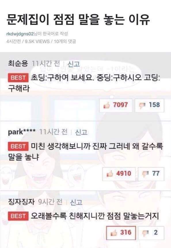 제가 알기로 5학년 때부턴가 문제집에서 갑자기 말을 놓더라구요