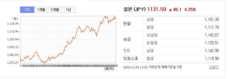 장 시작 초기 힐러리가 될꺼라는 믿음으로 1072까지 떨어젔던게 현제는 미친듯이 올라서 1131가고있죠 ㅋㅋㅋㅋ