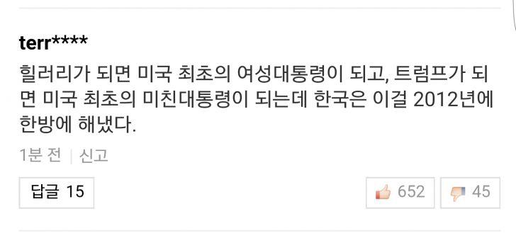 이 정도는 이명박 뽑은 거에 견줄 만한 듯 ㅋㅋㅋㅋ 트럼프는 박근혜에는 못 미치는 것 같아요 |