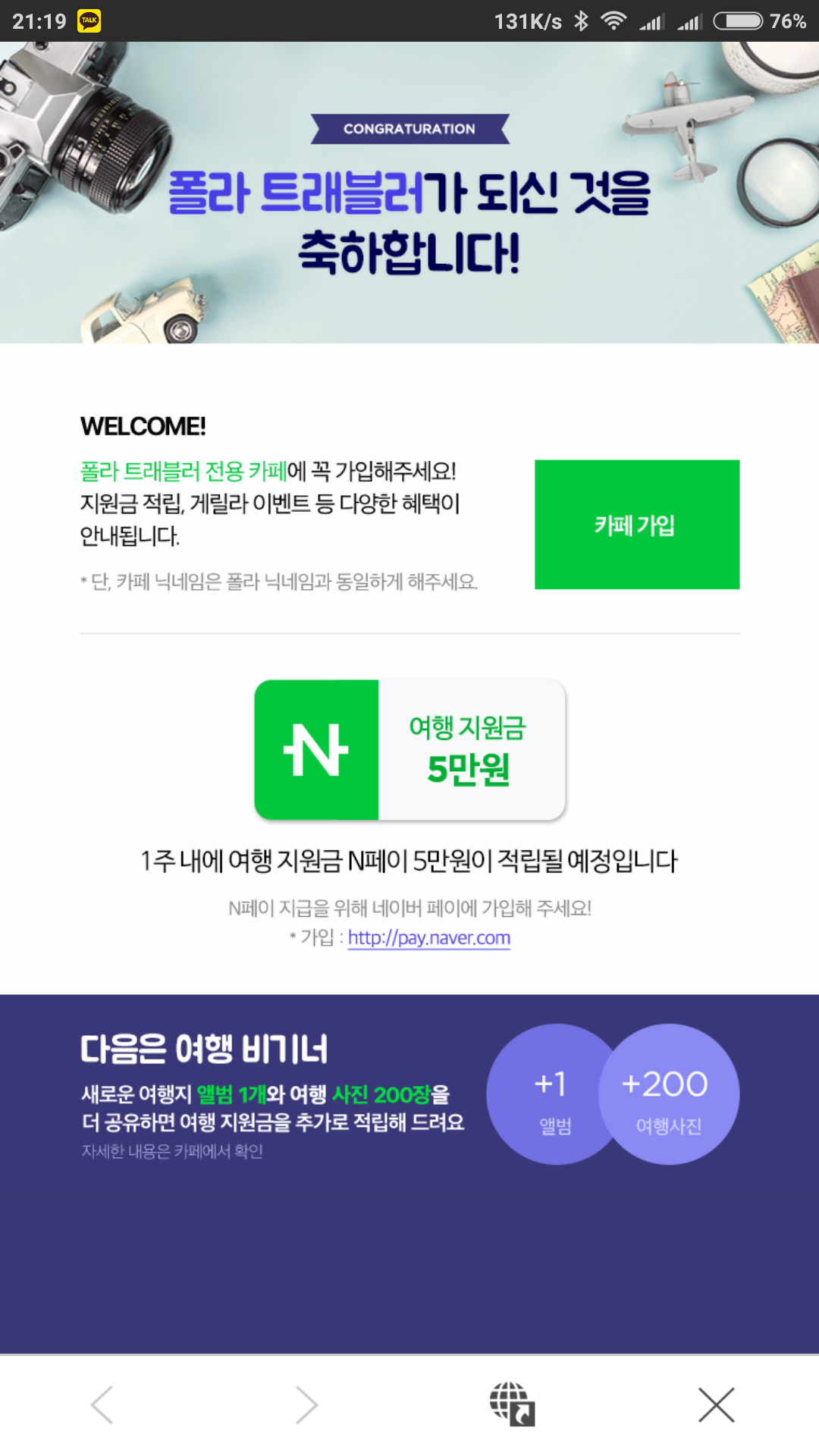 며칠전에 폴라에 여행사진 150장 업로드하고 폴라트래블러 신청만하면 만원받을 수 있다는 글 썼는데 신청 후 선정이 되면 5만원을 줍니다 ㅋㅋㅋㅋ