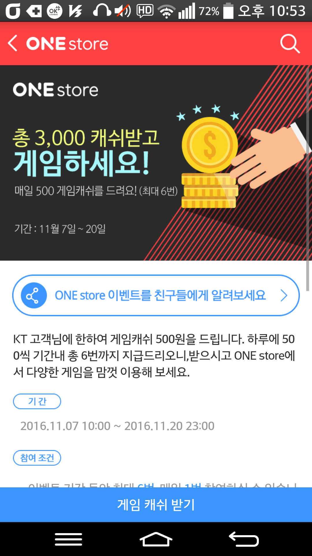 원스토어 kt고객 게임캐시 3000원받으세욧