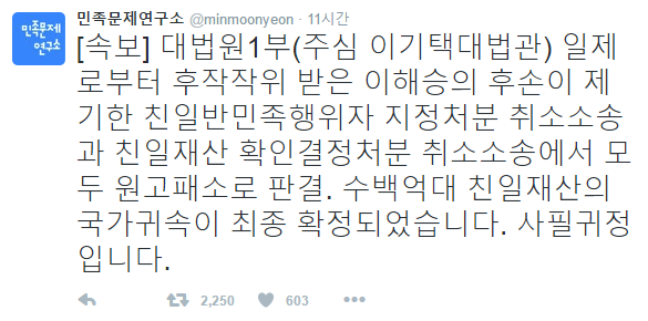 친일파 후손 재산 수백억대 전부 국가로 압류하는 대법원 판결이 하나 확정 되었네요