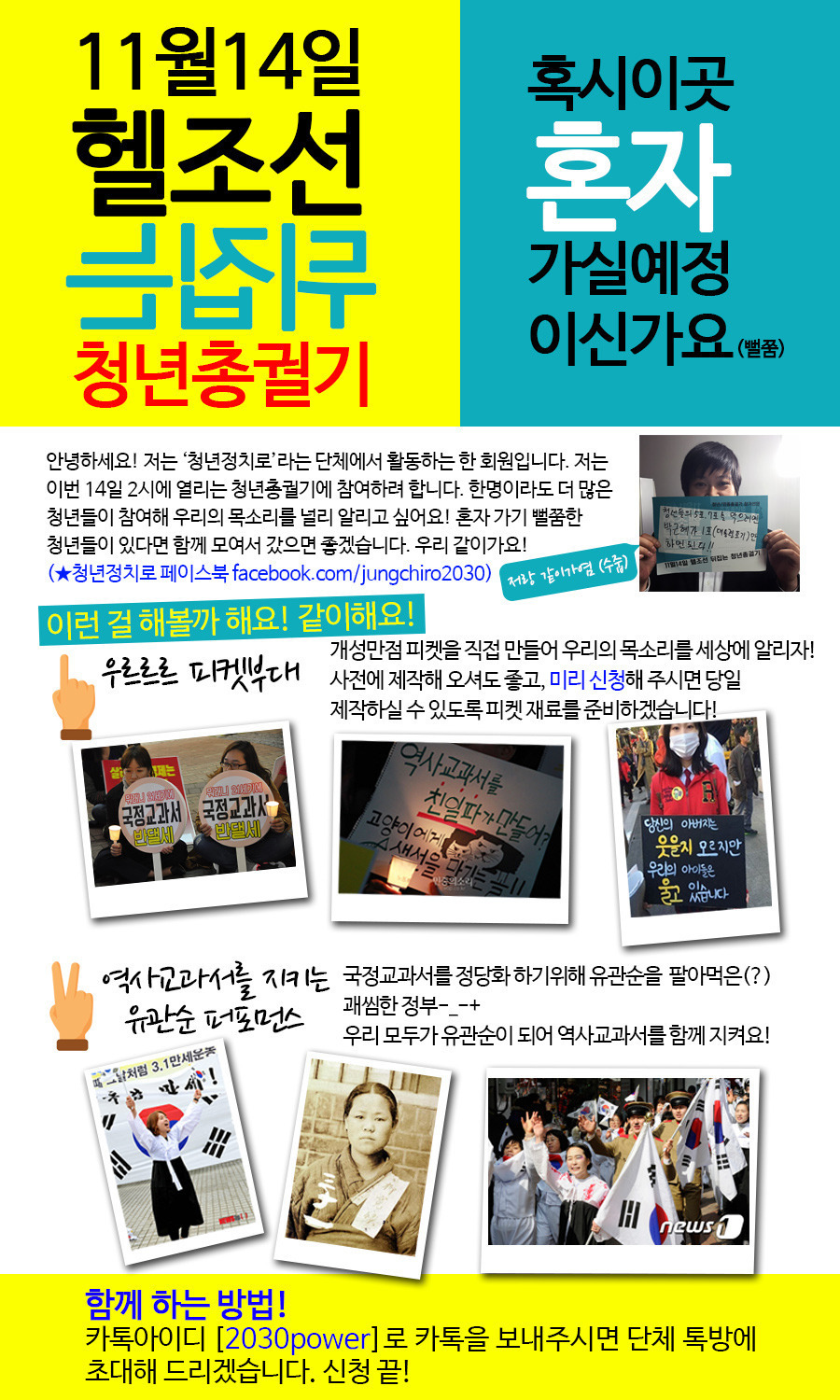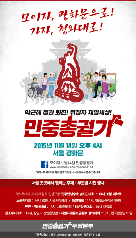 민주노총과 전국농민회총연맹 등 53개 단체로 이뤄진 ‘민중총궐기 투쟁본부’는 14일 오후 1~2시 대학로·서울역 광장·옛 삼성본관 앞 등지에서 역사교과서 국정화·노동개혁·쌀값 폭락 등 각종 현안을 놓고 참가단체별로 개별행사를 가진 뒤 오후 4시 서울광장에 모여 광화문광장으로 행진할 계획이다.