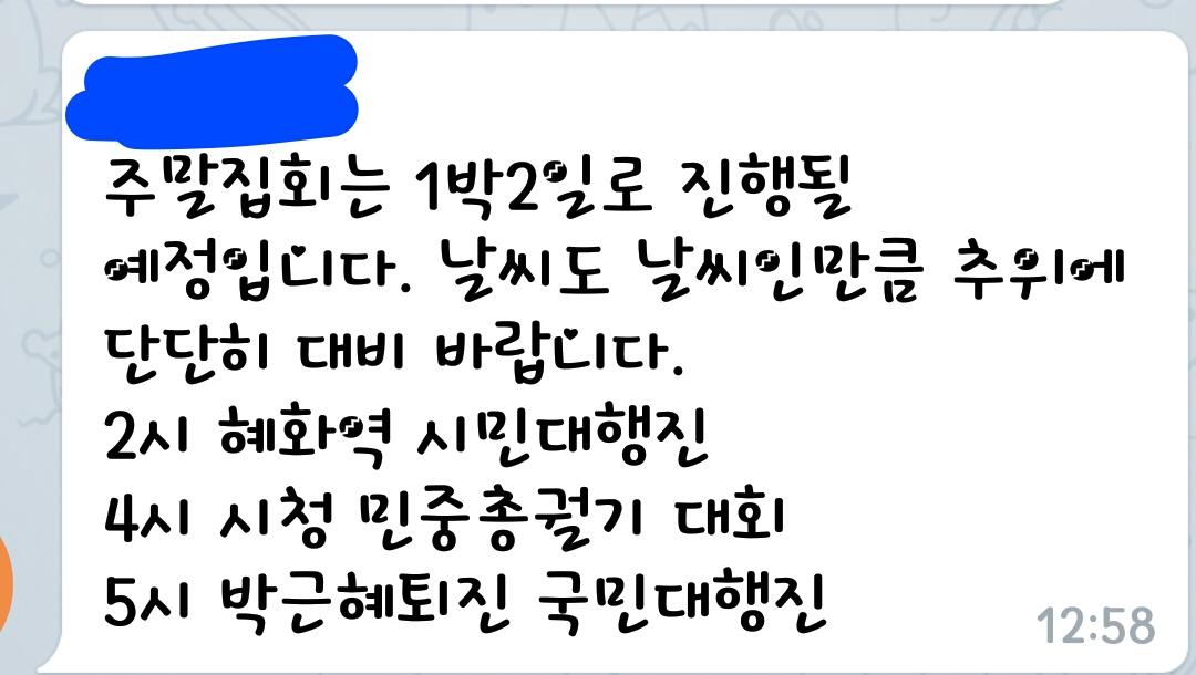 아... 집시법에 100미터까지 접근할 수 있다고 했는데... 일단 방한 준비 단단히 하고 혹시 모르니 우비 준비...