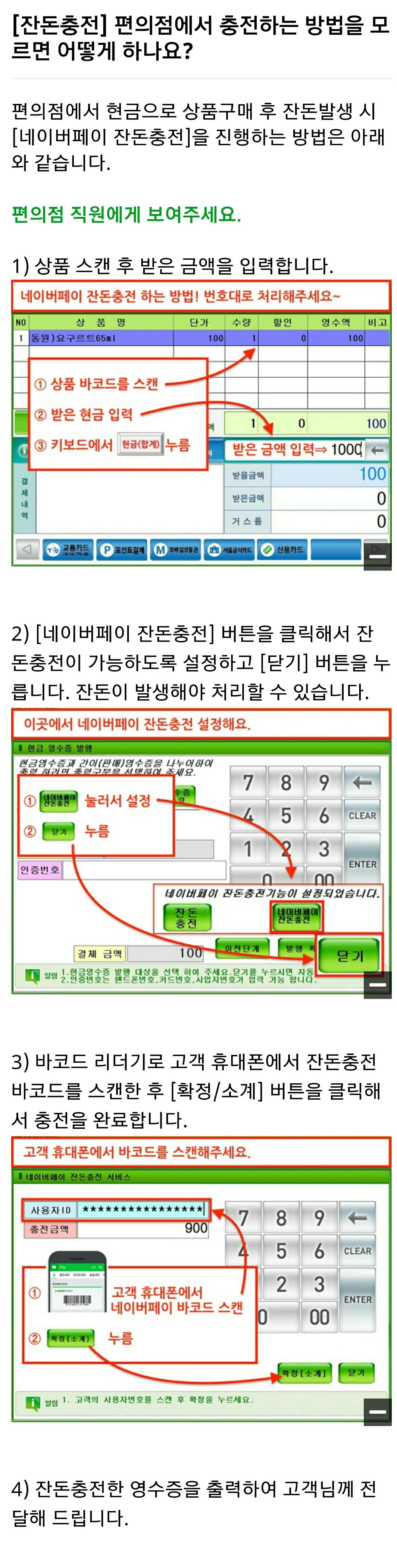 세븐 두군데 가봤는데 POS기 업데이트가 안된건지 "네이버페이잔돈충전" 버튼이 없고,