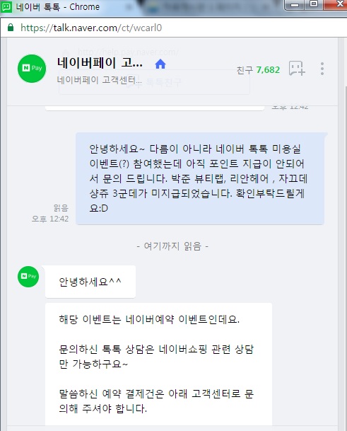 저는 이렇게 왔네요. 네이버페이하고 예약하고 다른 부서(?)인가 봅니다.