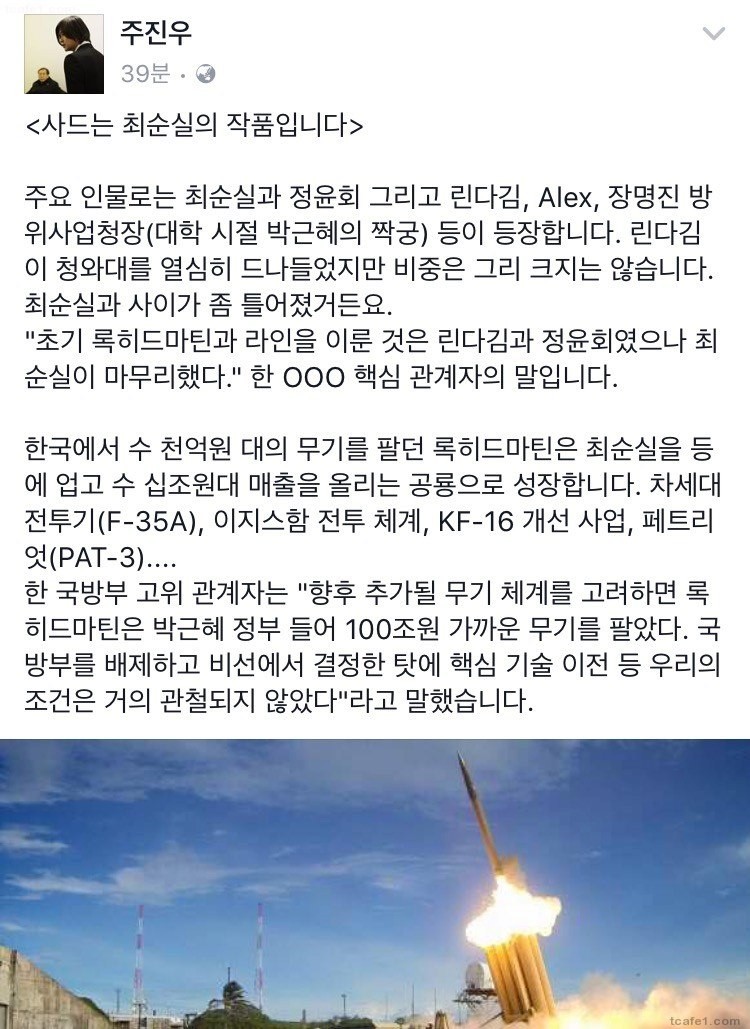 박근혜 정부 들어온 이후로 우리나라가 미국의 최대 무기 구입국가가 되는데, 예상은 되었던 문제라고 봅니다. 거기에 록히드 마틴 로비력 생각하면 당연히 제기 되었어야할 문제이고, 물증만 찾으면 되겠죠. |