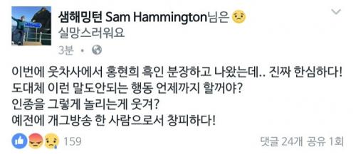 인종차별의 나라 호주출신 샘해밍턴이 저런말을 하니 좀 웃기긴 하네요 근데 이건 인종차별 맞습니다.. 어쨋든 인종을 가지고 개그의 소재로 희화화 했으니.. | ||