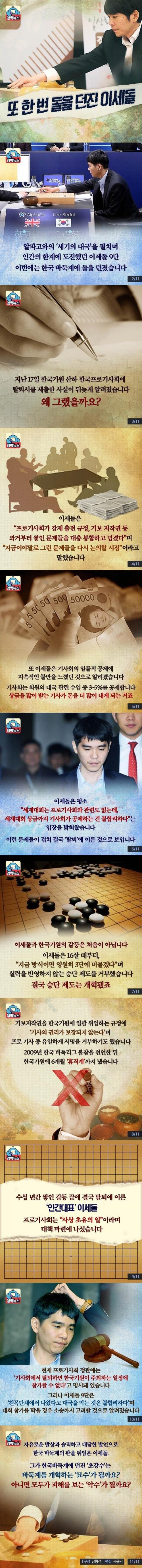 저 '협회스러운' 한국기원의 주축이 조훈현입니다. 이전에 이세돌과 충돌시에도 조훈현이 헛소리 많이 했죠. 참고로 조훈현은 현재 자유한국당 비례대표 국회의원 나리 되시겠습니다. 과거에 각계에서 한가닥하던 사람들이 새누리당 계열만 입당하면 쓰**가 되는 현상에 대한 논쟁이 있었죠. 원래 그런 놈이 그런 곳으로 들어간거다 vs 원래 안그랬는데 거기 들어가서 그렇게 된거다... 논쟁인데 조훈현은 전자(원래 쓰**가 쓰**통에 입실함)에 대한 근거로써 회자되던 분이시죠. 입당 전에 이미 자질이 충분히 검증된 분이셨습니다. | ||