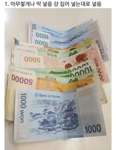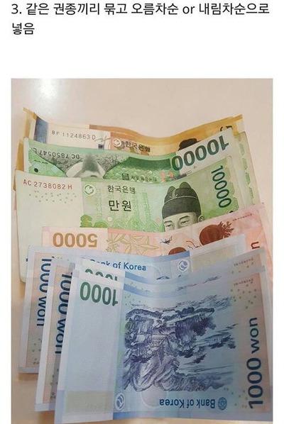 4번에서 변화된건데 걍 같은 지폐끼리 순서 상관없이 앞뒤 맞춰서 썼었어요. 요즘은 카드홀더만 가지고 다녀서 지폐는 몇장만 접어서 넣어요. 강박증 벗어난건가요? 정돈 된게 좋은데ㅎ | ||