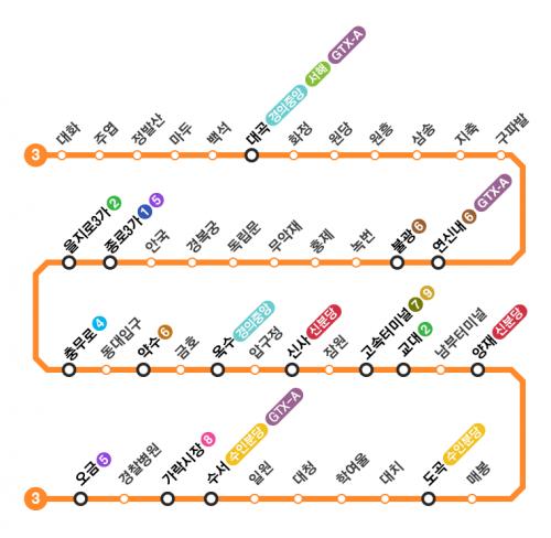 서울 지하철 3호선은 오금에서 대화까지 이어지는 남북 방향 노선으로, 총 연장 약 38km에 34개 역을 갖추고 있습니다. 이 노선은 강남, 압구정, 잠실, 고속터미널, 대치동 등 주요 업무·상업·주거 지역을 연결하며, 출퇴근과 통학, 쇼핑, 관광 수요를 충족시키는 핵심 교통망 역할을 합니다. 특히 환승역을 통해 2호선, 4호선, 5호선, 7호선 등과 연결되어 광역 이동성이 강화됩니다.