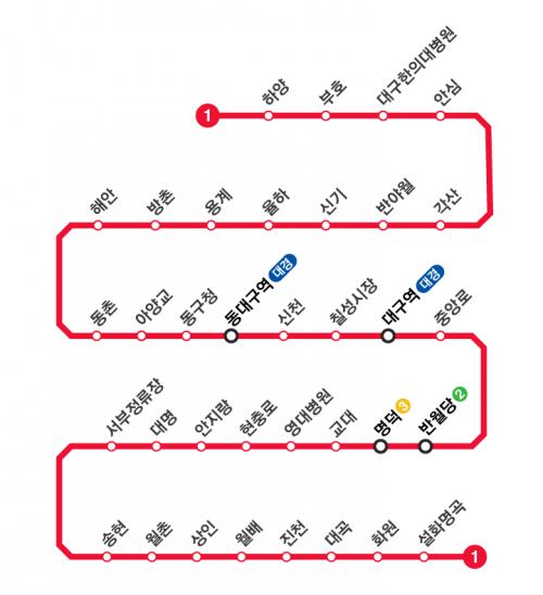 주요 환승 지점: 반월당역(대구 지하철 2호선 환승), 명덕역(대구 지하철 3호선 환승)