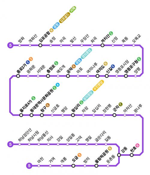 서울 지하철 5호선 노선도는 서울의 교통망에서 중요한 축을 담당하며, 출퇴근과 통학, 관광, 업무 이동에 최적화되어 있습니다. 서울 지하철 5호선은 서울 시민과 방문객 모두에게 편리함을 제공하며, 다양한 목적의 이동을 지원합니다.