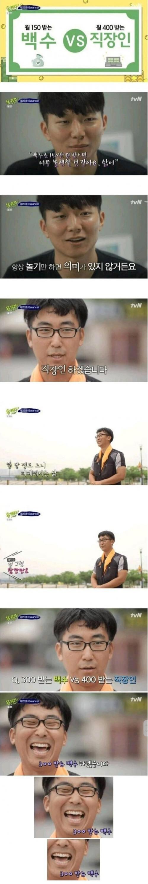 월 150만 원 받는 백수 VS 월 400만 원 받는 직장인 > 유머게시판